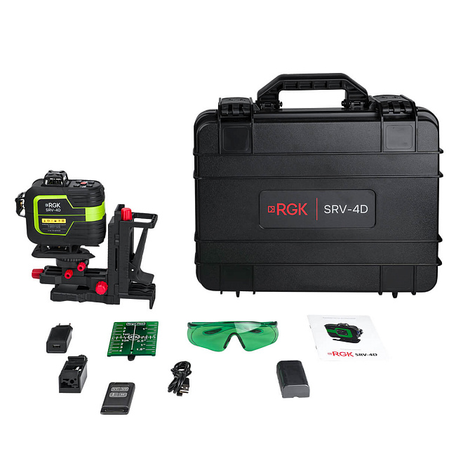 Лазерный нивелир RGK SRV-4D — уникальный инструмент, флагманская модель линейки лазерных построителей RGK, созданная для профессионалов. Прибор объединяет в себе лучшие технологии: высокоточный сервопривод для быстрого и стабильного самовыравнивания, яркие зеленые лучи для работы в любых условиях и функции, которые делают его незаменимым помощником на стройплощадке и при отделочных работах. Это передовая система для разметки, которая выводит вашу производительность на новый уровень.
